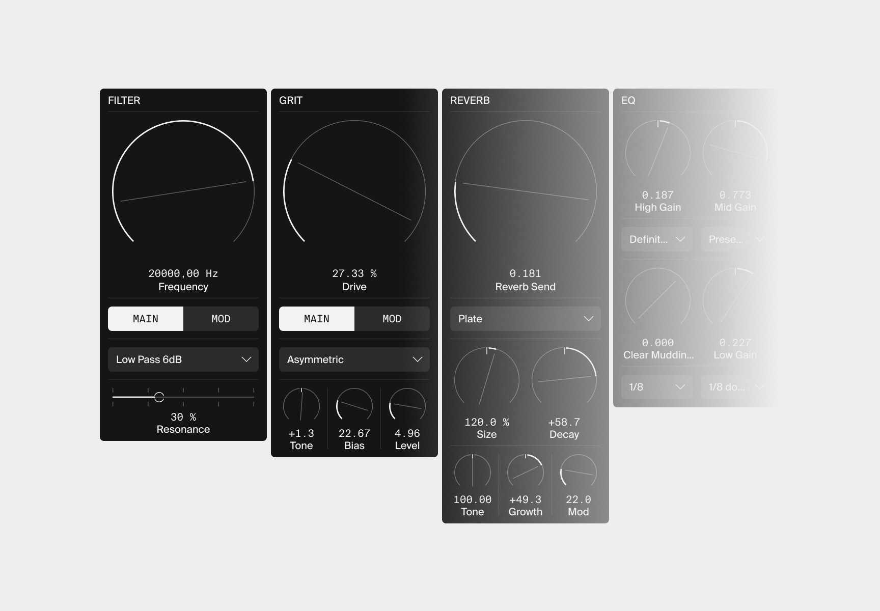 Whether you're morphing between tape-processed loops, blending synthetic textures, or creating evolving soundscapes that shift with gestural control, Orbits turns spatial movement into sonic transformation. Every nudge blends layers in real time, creating patterns that feel alive, flexible, and responsive. Orbits blends four sound sources across an X/Y pad, letting you morph between layers by moving a single control point. Each corner holds a selectable sound source—switch them out to explore different combinations and processing chains.
