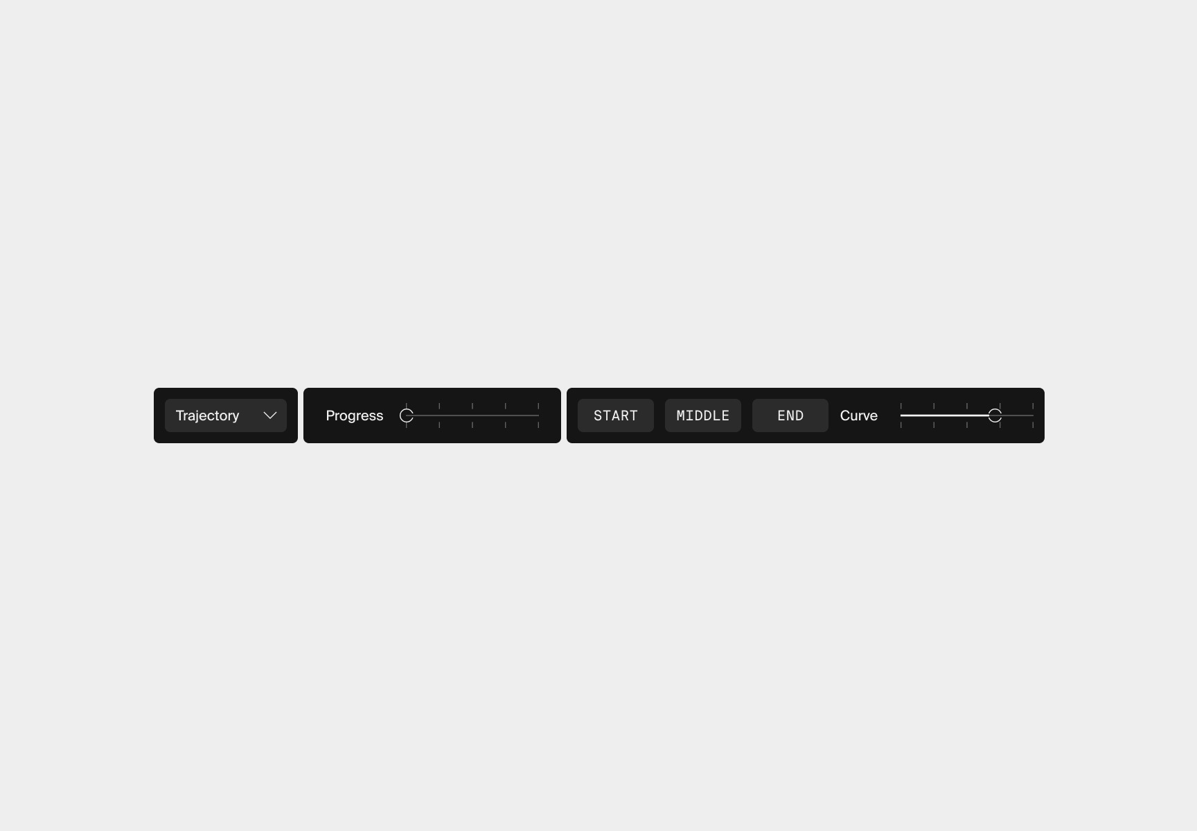 Orbit circles around a center point: Figure 8 traces crossover patterns, Spiral tightens inward with adjustable rotations, and Trajectory lets you draw custom paths with linear or curved transitions.